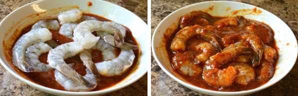 Misture todos os ingredientes da marinada em um recipiente, coloque os camarões, misture e deixe descansar na geladeira por 30 minutos.