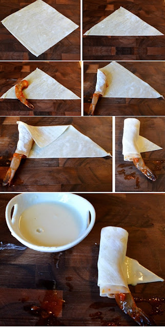 Corte a massa em formato de triangulo, enrole os camarões, passe  mistura de farinha com água nas pontinhas e grude.