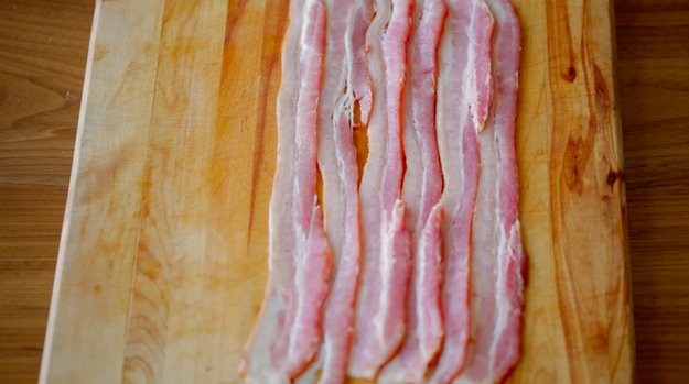 Arrume as outras 5 fatias, e enrole novamente o sanduíche, cobrindo as duas pontas que estavam sem bacon, fechando todo o sanduíche.