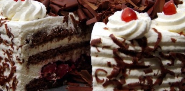 125 g manteiga 125 g açúcar 125 g farinha de trigo peneirada 125 g de amêndoas raladas 125 g de chocolate em barra ralado 6 ovos 5 gotas de extrato de baunilha 2 colheres de chá de pó Royal Para umedecer Respingue com 12 colheres de sopa de Kirsch (aguardente de cerejas) Para o recheio Aprox200 g de geleia de cerejas (preferência Sauerkirschen) com frutas inteiras 1/4 l de creme de leite fresco, batido em chantilly 50 g de cerejas ao marasquino, sem sementes ou cerejas cristalizadas Para a cobertura 100 g de creme de leite batido em chantilly 100 g de chocolate meio amargo, derretido e resfriado 5-6 colheres de sopa de chocolate raspado