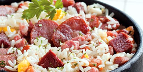 Se puder, use uma panela de ferro. Pique a alcatra em pedaços pequenos. Faça um refogado com o alho picado e depois acrescente a cebola. Logo em seguida inclua a carne, mexendo bem e acrescentando, na sequência, o sal, a pimenta e o cominho a gosto. Depois de formar o caldo da carne, acrescente o pimentão e a calabresa. Deixe cozinhar um pouco, coloque um pouco de manteiga e o arroz. Em seguida, coloque água até cobrir o arroz. Esse é o momento de experimentar e ver se precisa de mais tempero. Deixe cozinhar o arroz, decore com ovo cozido e sirva.