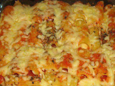 Quando o rigatone estiver cozido, escorra. Recheie cada rigatone com as tirinhas de presunto e mussarela e vá arrumando, em camadas, numa fôrma refratária. Entre uma camada e outra regue com molho de tomate e polvilhe queijo ralado. A última camada deve ser de molho e queijo ralado. Leve ao forno por 25 a 30 minutos.