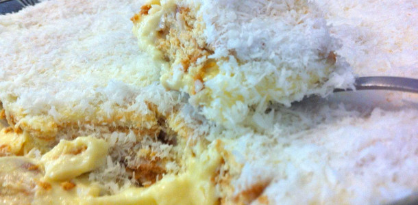Em um refratário, monte o pavê, alternando camadas de creme e de biscoito.