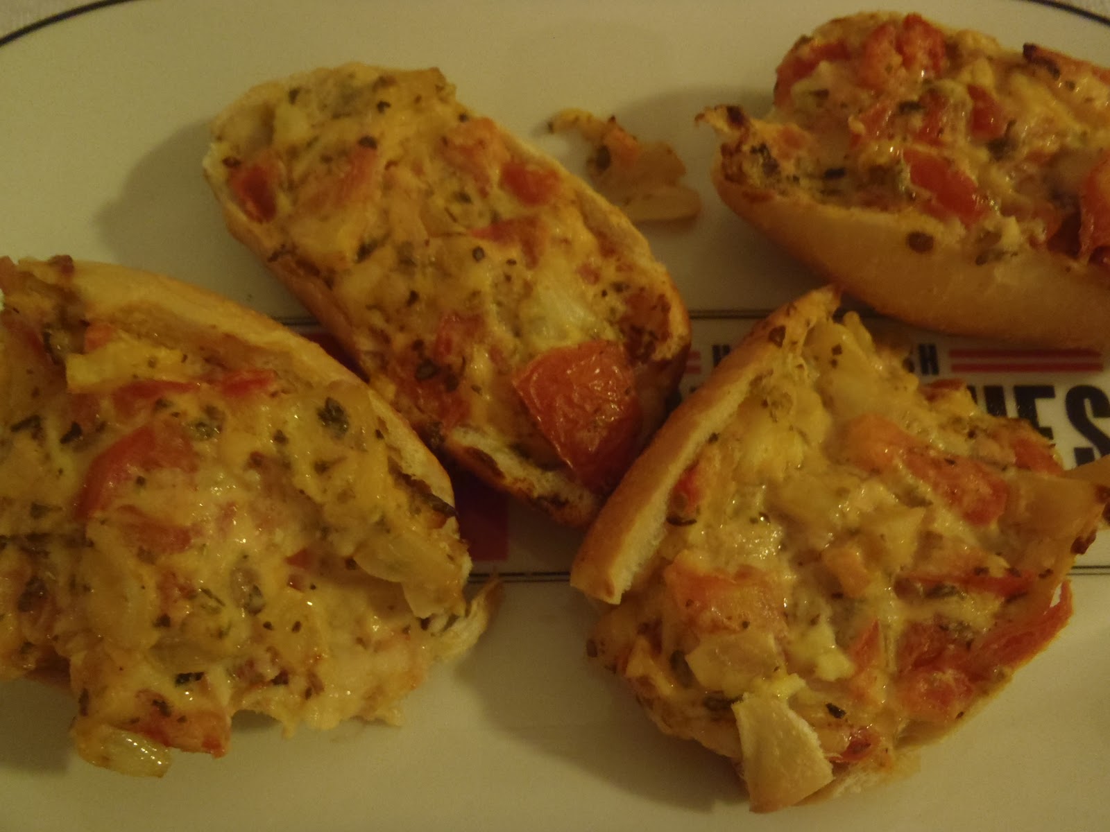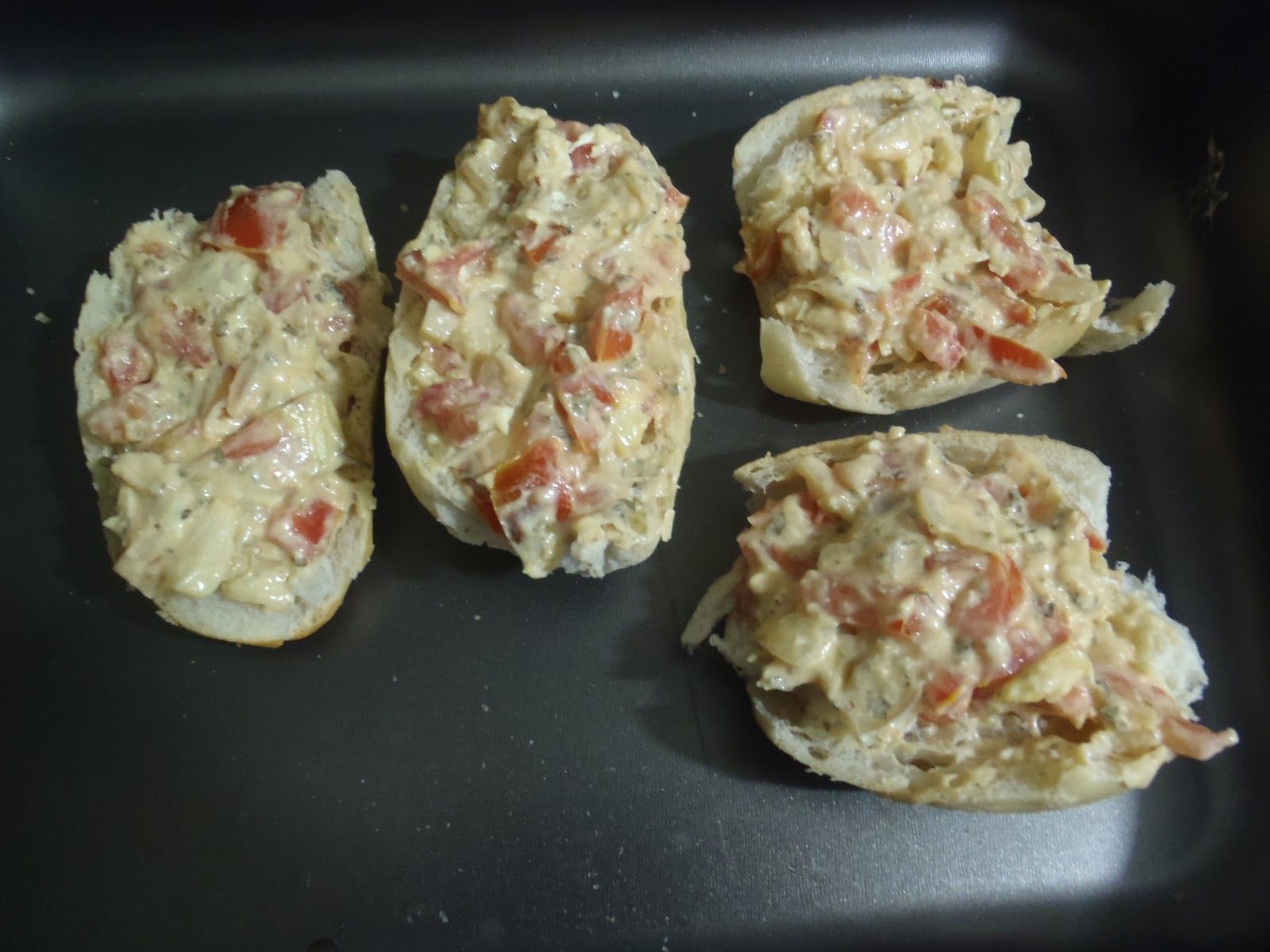 Refogue o alho e a cebola (é fundamental, faz toda a diferença) Misture todos os ingredientes em uma tigela. Mexa bem Corte os pães em metades e recheie, sem miséria Coloque um fio de azeite de oliva em cada metade Leve ao forno bem quente por cerca de 20 minutos