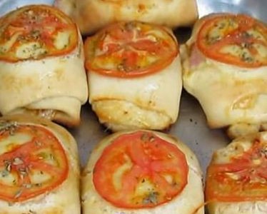 Corte as bordas da massa dos 2 lados maiores da mussarela e presunto. (como mostrado na imagem) e enrole deixando no formato do salgado (como mostrado na imagem) Repita o processo com os outros salgados, cubra cada um com 1 fatia de tomate e polvilhe com orégano (a gosto).