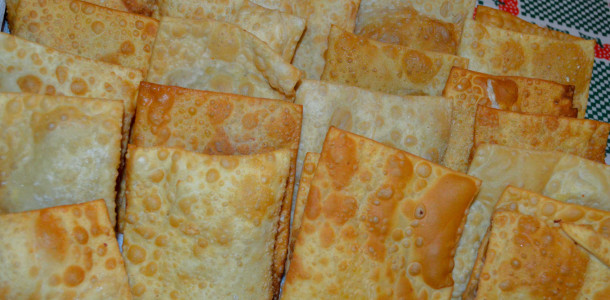 - Abra a massa de pastel, corte em retângulos, coloque o recheio e feche as laterais, apertando com um garfo para não abrir na hora da fritura.